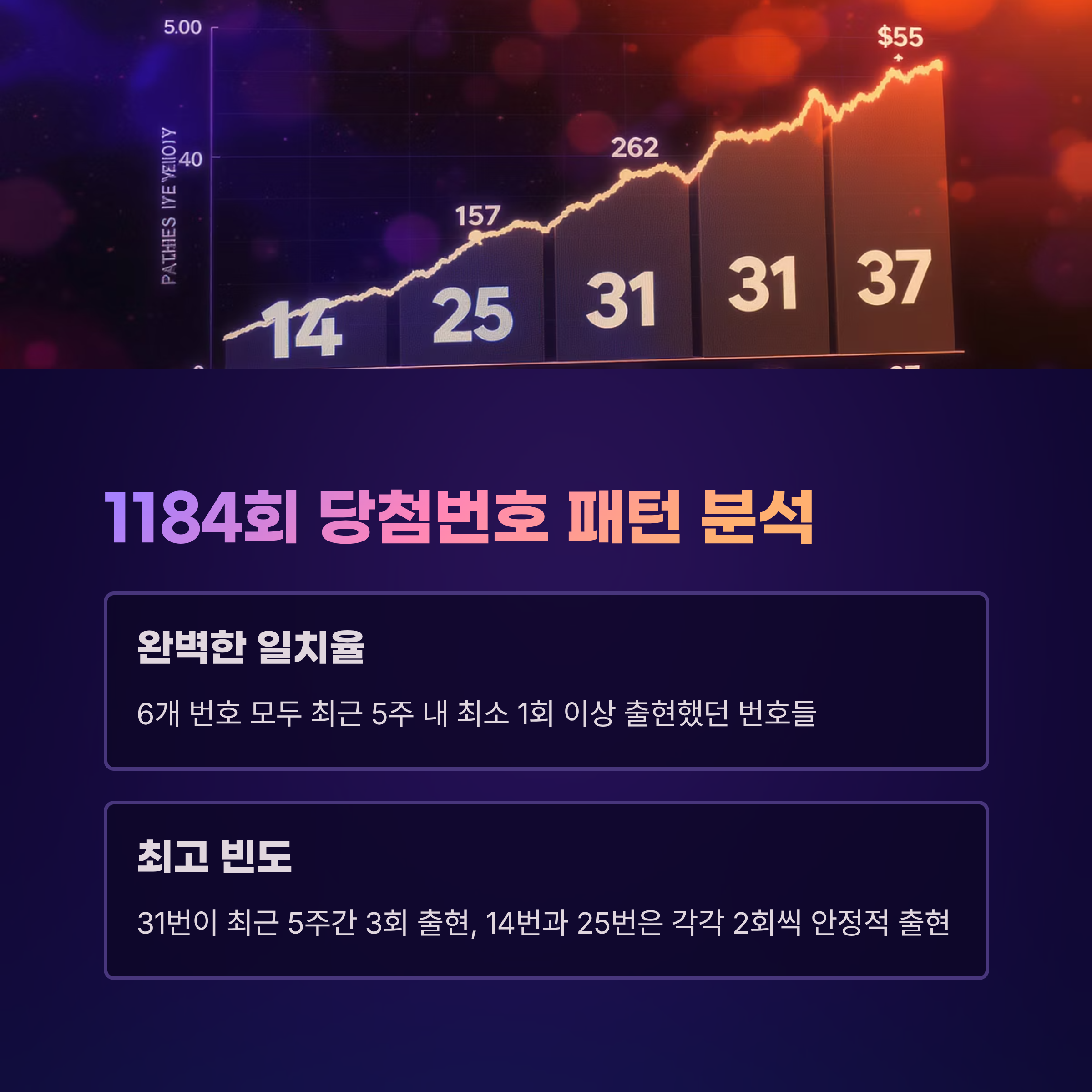 최근 분석에 따르면 1185회는 5주간 출현번호에서 4개 이상이 일치될 것으로 전망됩니다. 이는 1184회의 6개 일치에 이어 출현 번호 강세가 지속될 가능성을 시사합니다. 최근 5주간 출현 횟수 상위권인 31번(3회), 14번·25번·28번·23번·37번·41번(각 2회)이 핵심 후보군입니다.
