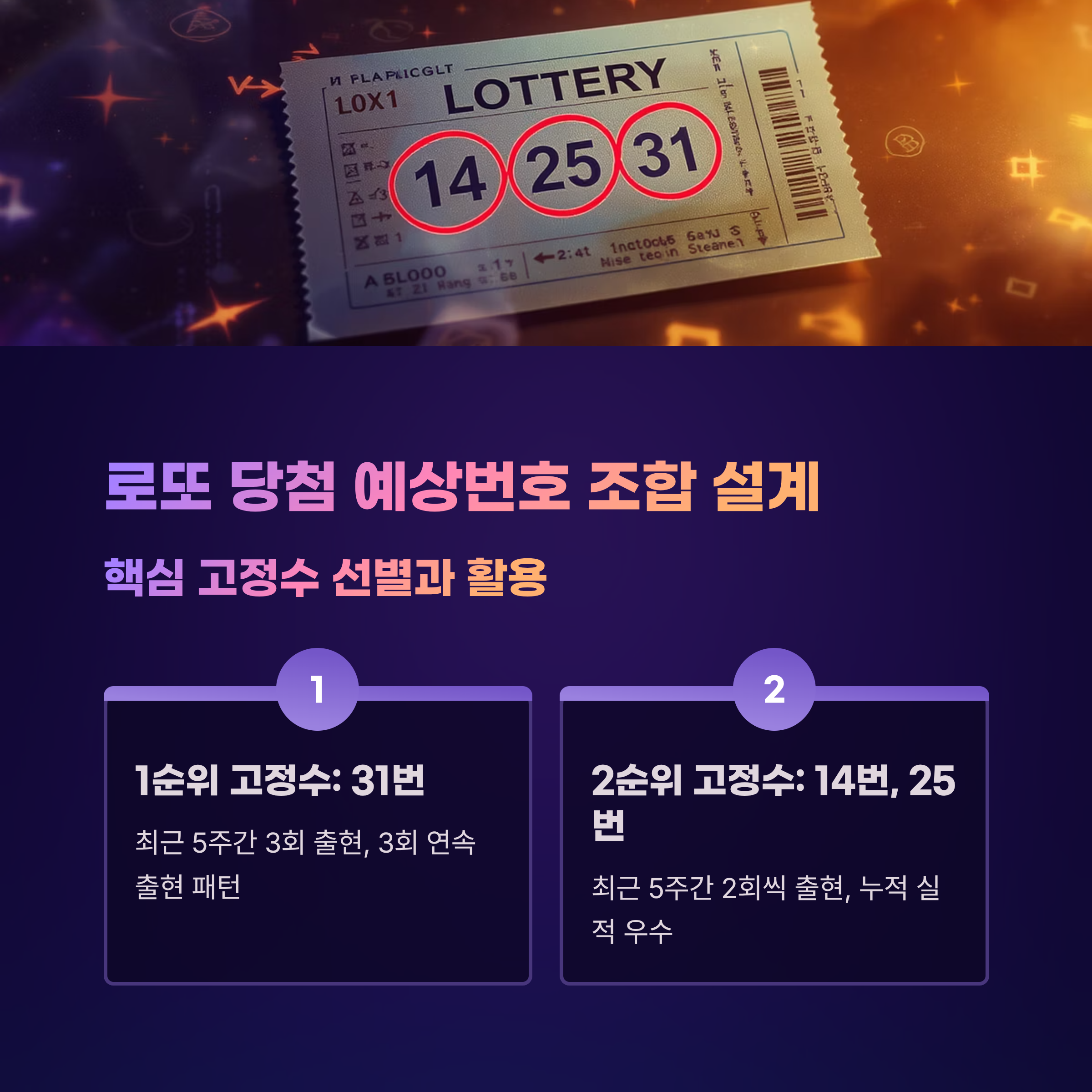 14번과 25번을 2순위 고정수로 고려할 수 있습니다. 두 번호 모두 최근 5주간 2회씩 출현하며 일정한 리듬을 유지하고 있고, 역대 누적에서도 14번은 190회, 25번은 167회로 충분한 실적을 보유하고 있습니다.