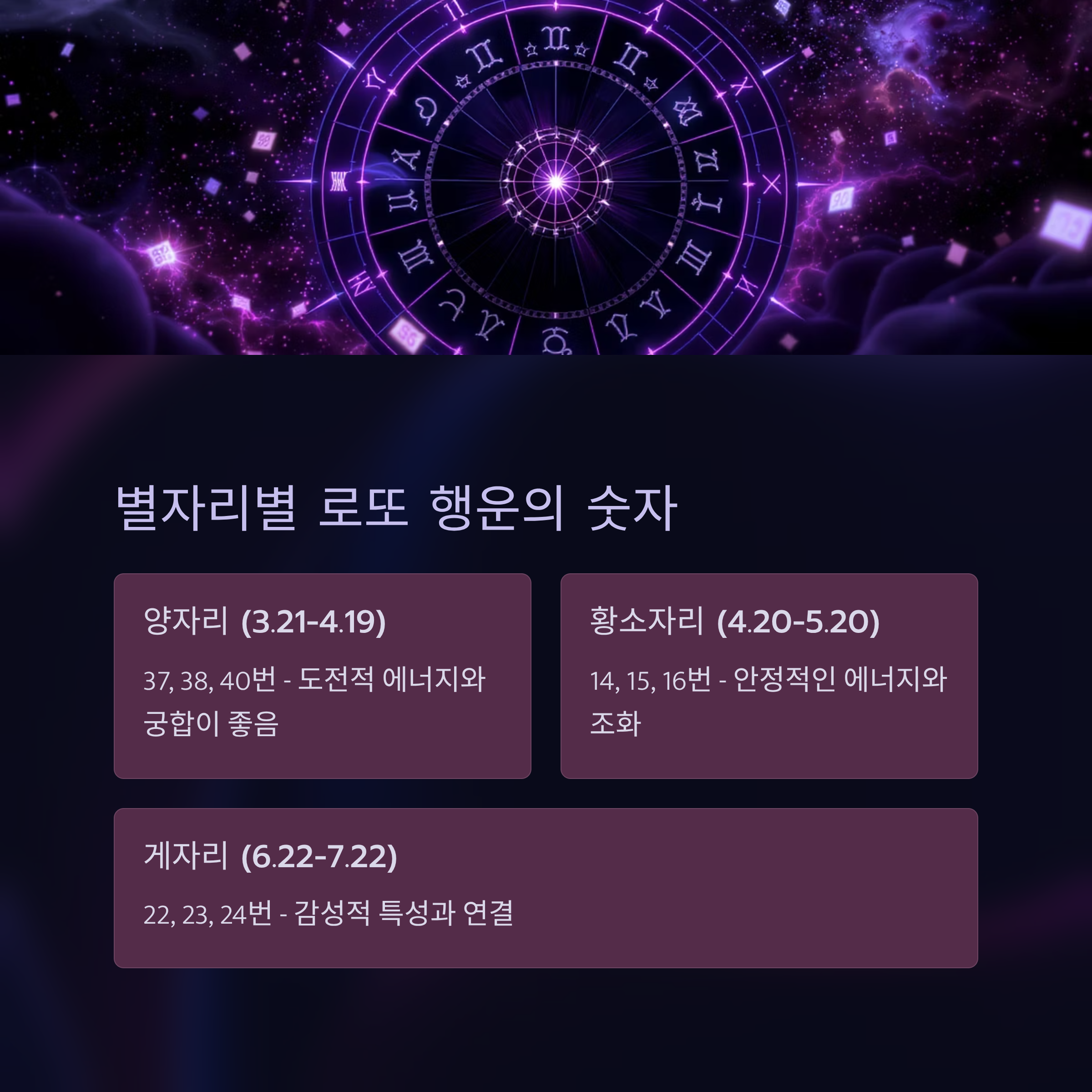 게자리(6.22-7.22)는 감성적이고 직관적인 특성으로 20번대 초반 숫자들과 특별한 인연을 가집니다. 22번, 23번, 24번 등이 게자리의 섬세한 감성과 잘 어울린다고 여겨집니다. 사자자리(7.23-8.22)는 리더십과 화려함을 상징하여 40번대의 높은 번호들이 행운의 열쇠가 됩니다.