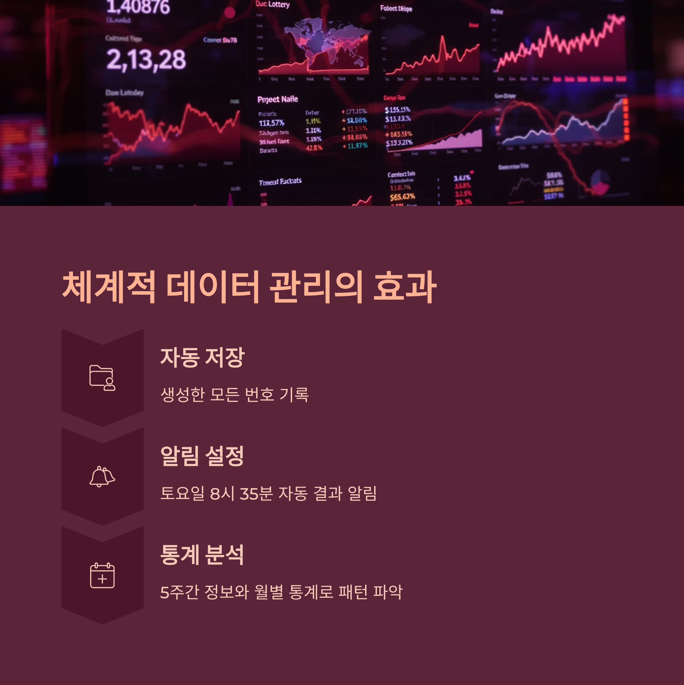 무엇보다 최근 5주간 정보와 월별 통계 기능을 통해 과거 패턴을 손쉽게 분석할 수 있어 다음 회차 예상의 정확도를 높일 수 있었습니다. 이런 기능들을 종합 활용하면 감에 의존하지 않는 과학적 접근이 가능해집니다.