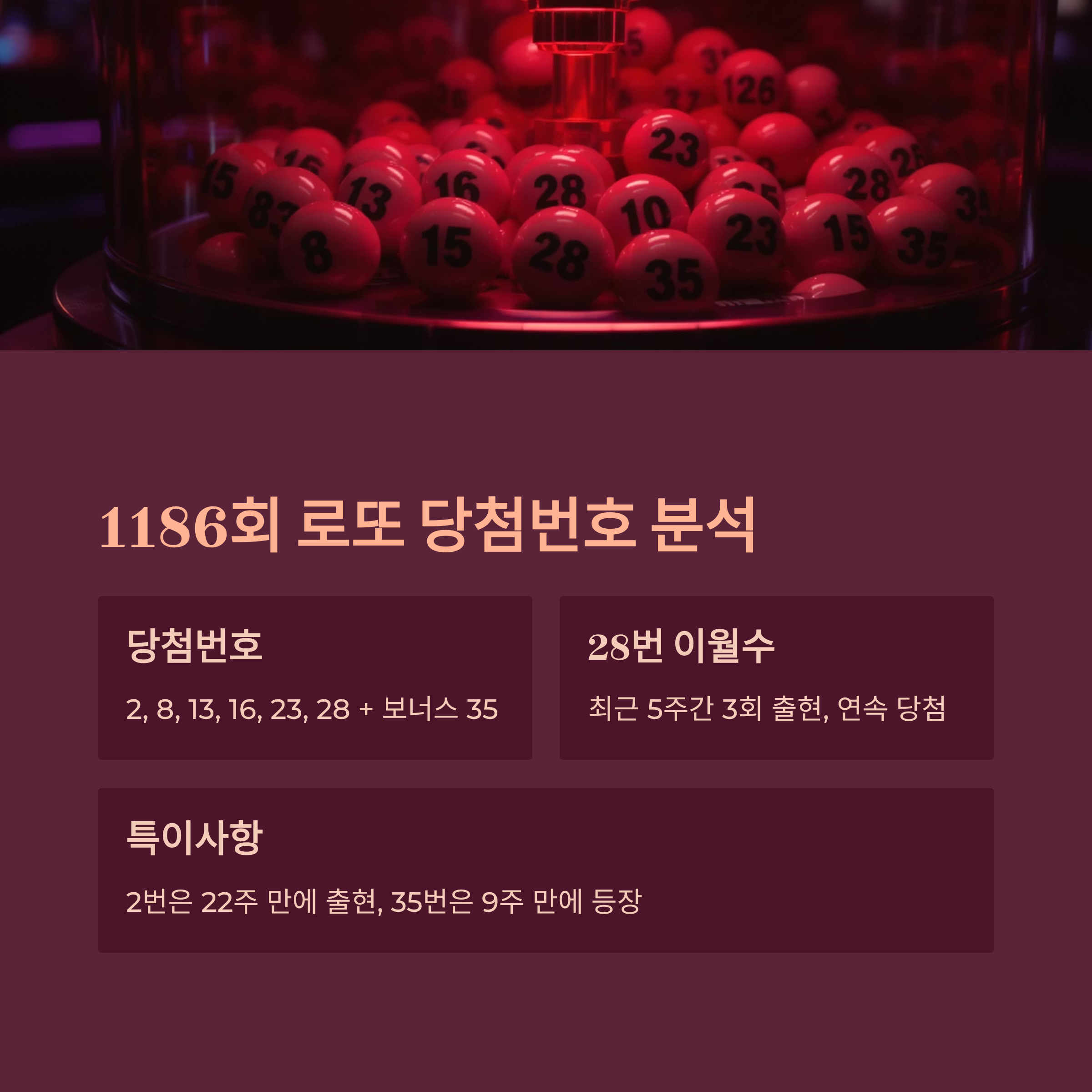 1186회 로또 당첨번호 2, 8, 13, 16, 23, 28과 보너스 35번에서 가장 눈에 띄는 특징은 28번의 이월수 현상입니다. 직전 1185회에서 이어진 연속 출현으로 최근 5주간 당첨횟수 3회를 기록하며 최상위권을 유지했죠.