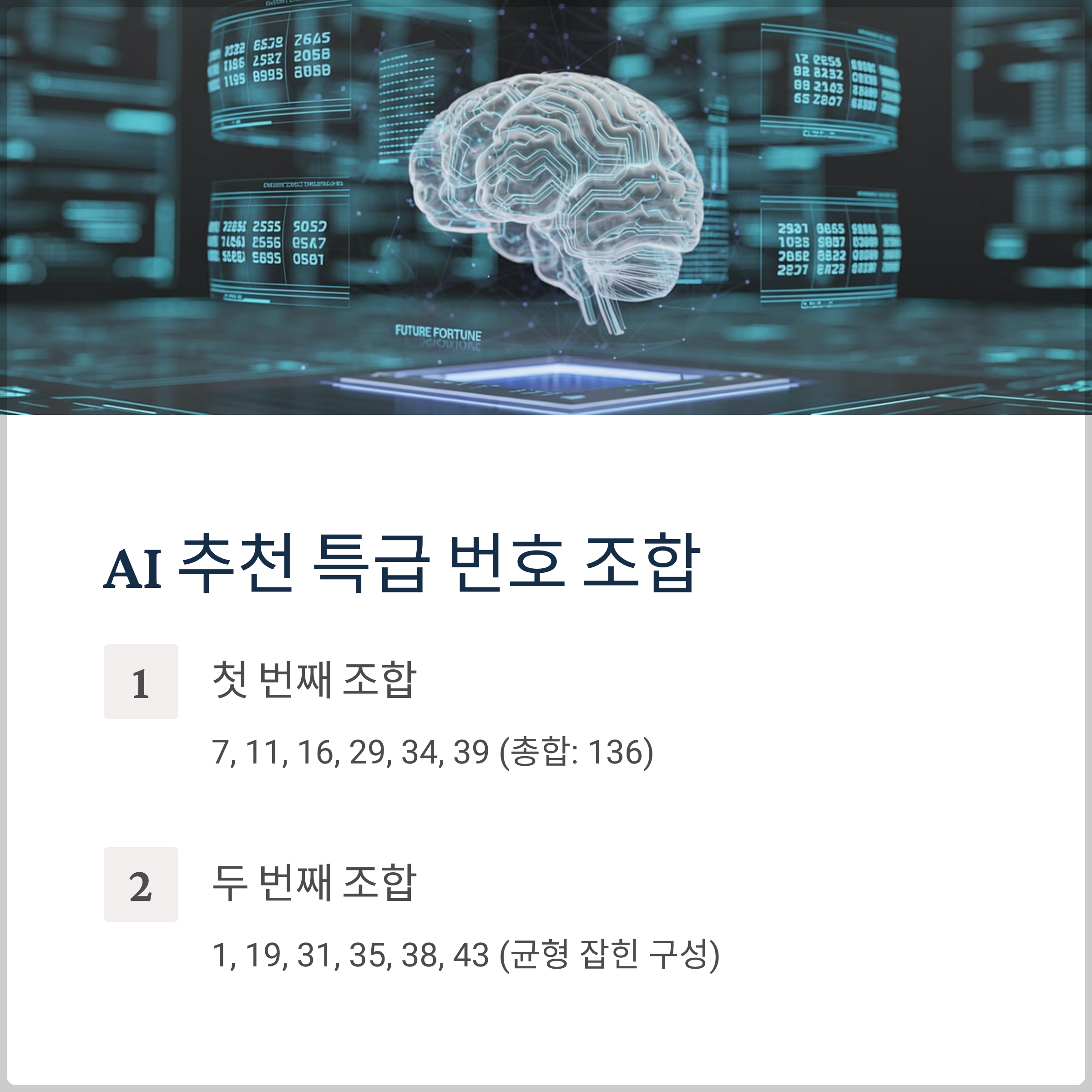 AI 분석을 통한 1178회 첫 번째 예상번호는 7, 11, 16, 29, 34, 39입니다. 7번은 최근 5주간 2회 출현과 3호기에서 3회 출현 기록을 바탕으로 선정했습니다. 11번은 3호기 최근 패턴에서 4회 출현으로 가장 높은 선택 근거를 가집니다.